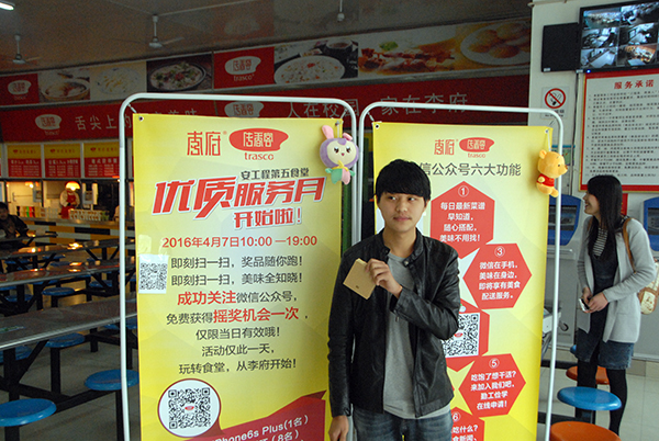 本次微信公众号推广活动用微信平台“幸运大转盘”摇奖的方式,关注后即可获得摇奖机会一次,奖品从一等奖的苹果手机,二等奖的智能手环...到六等奖的精美钥匙扣。该活动获得了校方和学校师生的一致认可,一致赞赏我公司在优质服务月中通过微信扫码抽奖的方式回馈师生,也通过微信进一步的拉近了食堂与顾客、监管方之间的距离。