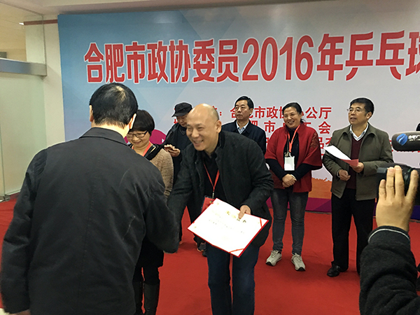 由合肥市政协办公厅所举办的“2016年乒乓球、掼蛋比赛”于11月初正式吹响比赛的号角。本次活动得到市政协主席杨思松,副主席储昭平、奚芝英、金其武、丁家康,秘书长袁文长等多名政协领导的大力支持。集团董事长辛董作为合肥市政协委员、合肥市庐阳区政协委员、中国民主促进会会员应邀参加掼蛋比赛,并最终获得掼蛋比赛第二名的好成绩,杨思松主席亲自上台为其颁奖。