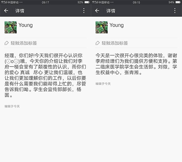 这次学雷锋活动不仅拉近了传香客安医大食堂与安医大学生之间的距离,并且让同学们体会到食堂工作的专业性与严肃性,同学们对食堂工作也有了新的认知与理解。在今后的工作中,李府传香客安医大食堂将持续开展类似的公益活动,让同学们体会不一样的校园生活。同时食堂管理将一如既往地秉承“质量卫生安全求生存、主动服务创新求发展”的经营宗旨,为安徽医科大学全校师生提供优质、放心、满意的餐饮服务。