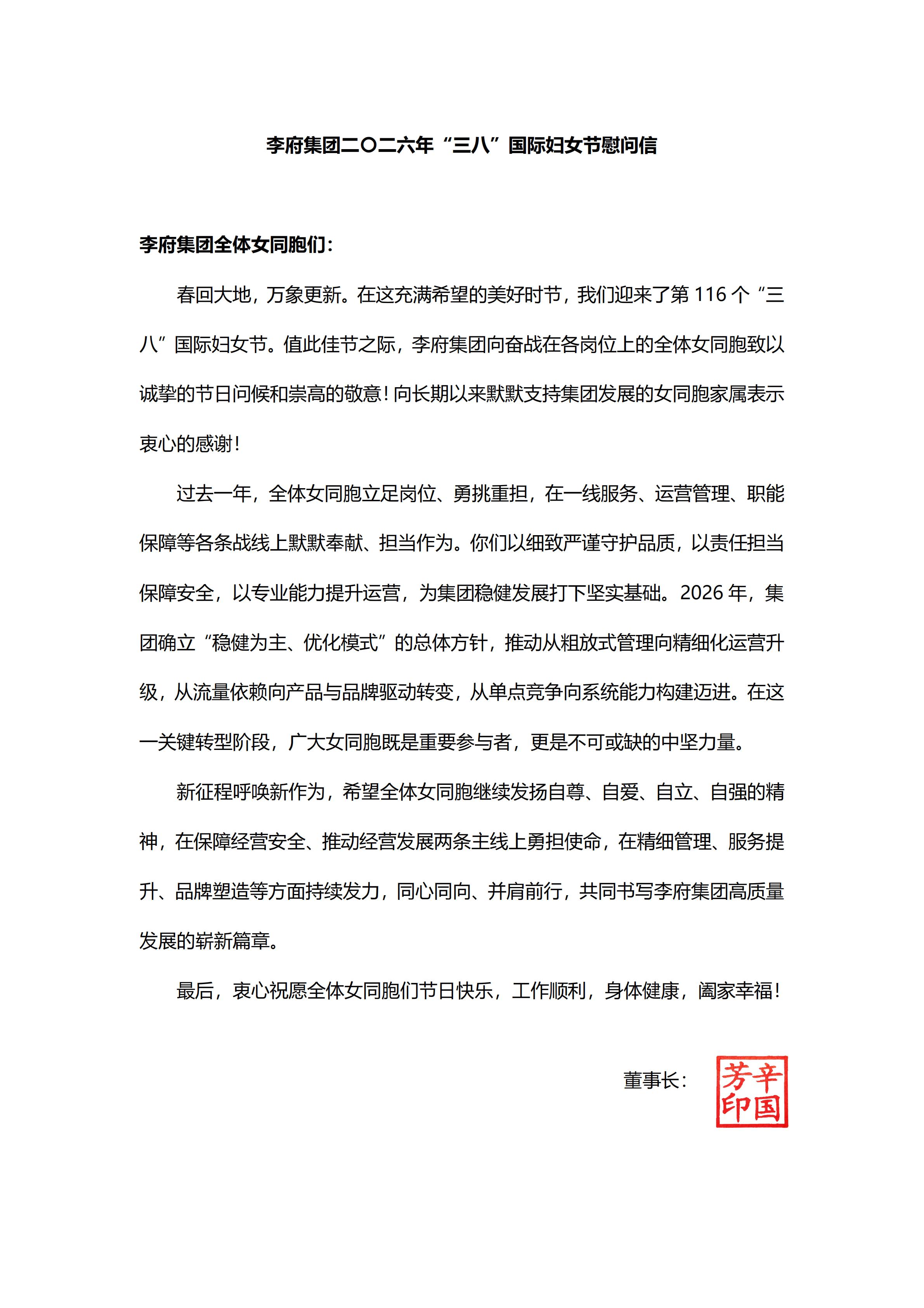 李府集团二O二六年”三八”国际妇女节慰问信