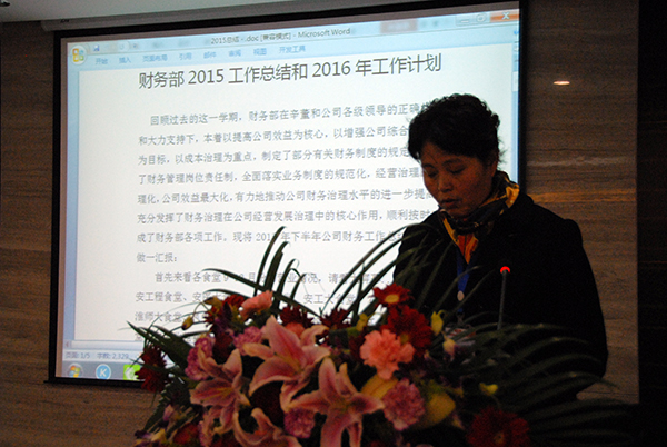 财务部经理唐晓青作了公司2015年财务报告。整个报告用详实的数据、科学的统计分析,全面向与会人员展示了2015年公司发展情况。在业绩总额、人均产值、毛利率等关键性经营指标中,均比2014年同期有了较大幅度的提高,同时能耗比和成本率大幅度下降,成本控制效应凸显。根据2015年各食堂经营情况,财务部按照集团要求,合理制定并公布了明年各食堂经营目标任务。