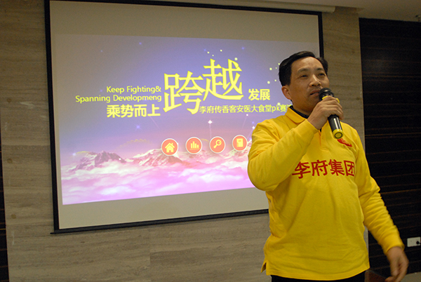 2017年1月22日下午2时,李府集团《企业自转智慧系统》第四次内部碰撞会在集团总部多功能会议室隆重举行。出席本次大会的嘉宾有我集团董事长辛董、副总经理尹正会、副总经理张超等集团各部门负责人及集团下辖各传香客食堂经理、副经理、厨师长等管理人员和传香客各食堂落地委分委。集团总部全员参会。