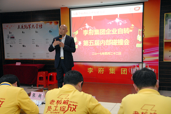 2017年4月22日下午两点,李府集团《企业自转智慧系统》第五次内部碰撞会在集团总部多功能会议室隆重举行。出席本次大会的嘉宾有我集团董事长辛董、副总经理尹正会、副总经理张超、集团总部各部门负责人、集团下辖各传香客食堂经理、副经理、厨师长等管理人员和传香客各食堂落地委分委成员。