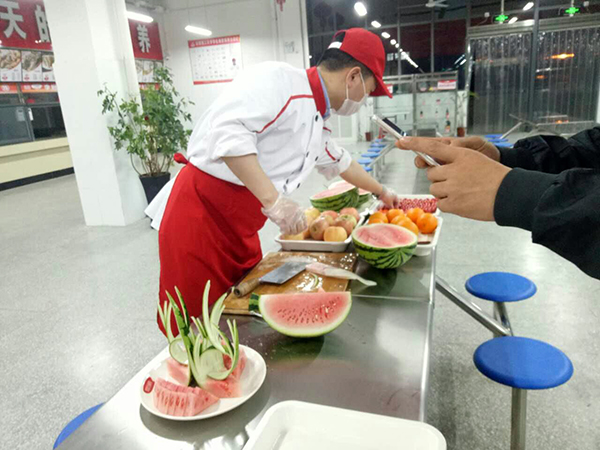 活动正式开始,集团技术部总监兼传香客安理工食堂经理王士朝开始了水果拼盘的现场教学。西瓜、圣女果、橙子、苹果等各种水果在他的创意和精细的刀工下,被改造成片、丁、丝、块等形状,拼放成各种图案,拼盘色彩艳丽、精美绝伦,赢得了同学们的赞赏与惊叹。紧接着,王总监指导大家发挥自己独特的想象力,根据每个人所选的水果进行构思、雕刻和拼接。现场气氛热烈,拍照上传朋友圏的有之,现场视频直播的有之,同学们边学边玩,兴高采烈。
