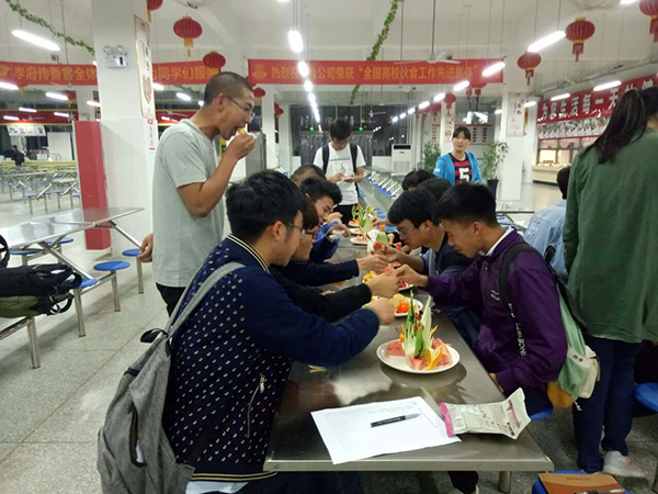 在“五四青年节”这天晚上,为丰富同学们的生活,鼓励饮食健康,在安理工后勤保障部饮食中心的指导与支持下,安理工B区爱苑二楼李府传香客食堂举办了以“青春盛宴,水果狂欢”为主题的水果拼盘教学活动。本次活动吸引了电气学院学生会和社团约三十名小伙伴们参加。