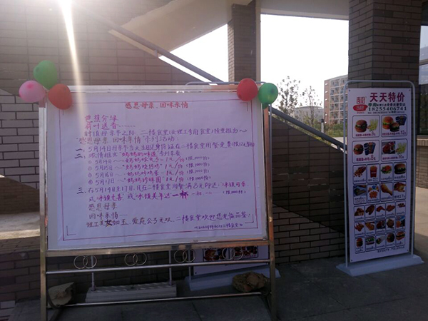 你看,由共青团安徽医科大学委员会、学生联合会主办,李府传香客安医大食堂承办的“情系母亲节—妈妈,我爱你!”活动如火如荼的开展。活动期间,同学们可以在展板上留言或通过视频的方式将自己的爱回流至母亲。同时,李府传香客安医大食堂通过微信、QQ等方式征集同学心目中象征“妈妈的味道”的菜品及菜肴,并在母亲节当天烹饪供同学们品尝。