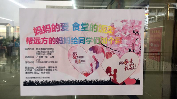 “爱子心无尽,归家喜及辰。寒衣针线密,家信墨痕新。”2018年的母亲节如约而至,我集团下辖各传香客食堂紧紧围绕“弘扬母亲节,李府伴你行”为主题开展各类回馈活动,倡导在校莘莘学子及时行孝,回报母爱,共建校企文化。