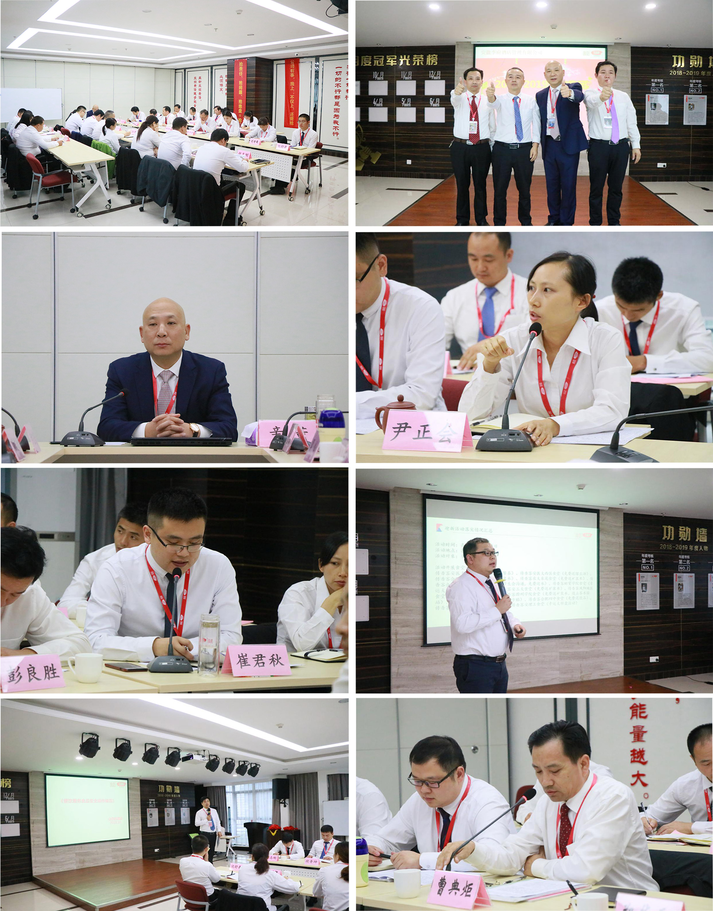 会议在主持人开场致辞及全体人员合唱《歌唱祖国》歌曲中拉开帷幕。会议开始,辛董上台揭幕了集团2018-2019年度功勋人物(分别是彭良胜经理、曹典炬经理、宣以顺经理),并向三位经理表示祝贺并赋予期望,三位经理纷纷表示将珍惜荣誉,在今后的工作中更加努力奋进,不辜负公司领导的信任。之后集团各部门负责人就本部门9月份的工作重点进行汇报。财务部主管何燕就集团下辖各传香客食堂6-8月经营完成情况进行数据分析;副总经理尹正会宣读人力资源部下发的红头文件,公布9月份人力资源部对各传香客食堂经理的考核结果,同时对各食堂9月份人均产值进行分析,并将人力部9月份的工作进行汇报;副总经理张超对9月份六T排行榜进行通报,并针对目前各传香客食堂整体营运工作深入点评、剖析,同时对下月工作重点、工作目标进行相应的布置;事业部经理梁灿围绕当前事业部9月工作进行汇报,并对传香客食堂10月份营销活动进行计划和部署;随后总经办经理崔君秋宣读集团下发的红头文件,同时宣读《食堂设备使用管理规定》,并将总经办的9月份工作进行汇报。