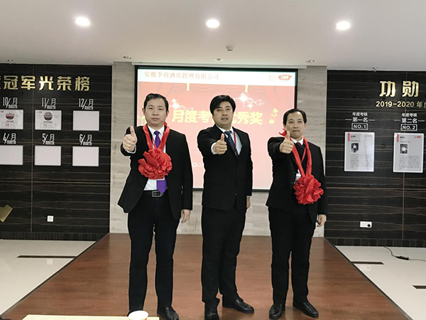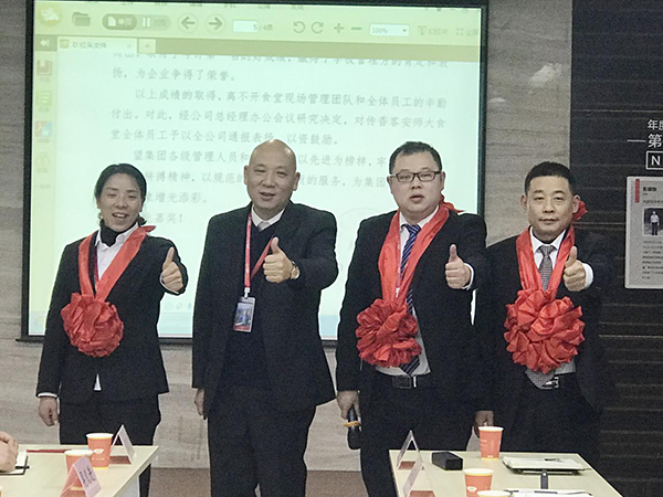 培训结束后,正式进入会议时间。本次会议在主持人开场致辞及全体人员合唱《团结就是力量》歌曲中拉开帷幕。会上集团各部门负责人就本部门11月份的工作重点进行汇报。财务部主办会计张跃就集团下辖各传香客食堂11月经营完成情况进行数据分析,并对财务工作进行了布置和要求;副总经理尹正会代表人力资源部公布了11月份各传香客食堂经理的考核结果以及本年度各经理的综合考核情况,并对11月份考核优秀的彭良胜经理和曹典炬经理进行了表彰颁奖,两位经理就自己如何立足本职岗位把工作在做好的基础上做的出色进行了分享;同时就10月份各食堂的用工情况、人均产值及工资支出情况作出详细的同期对比分析;运营管理部经理段鲁坤对各食堂11月份六T考核排行榜进行通报;副总经理张超对11月份各传香客食堂接受第三方监管公司检查的结果及整改前后的图片进行通报,并对目前各传香客食堂整体运营工作深入点评、剖析,同时对下个月工作重点、工作目标进行相应的布置;总经办经理崔君秋宣读集团下发的红头文件,对传香客安师大食堂在安徽师范大学总务处组织的全校餐饮服务单位10月份考核检查中获得第一名的优异成绩进行了表彰,并对总经办工作进行了布置和要求。