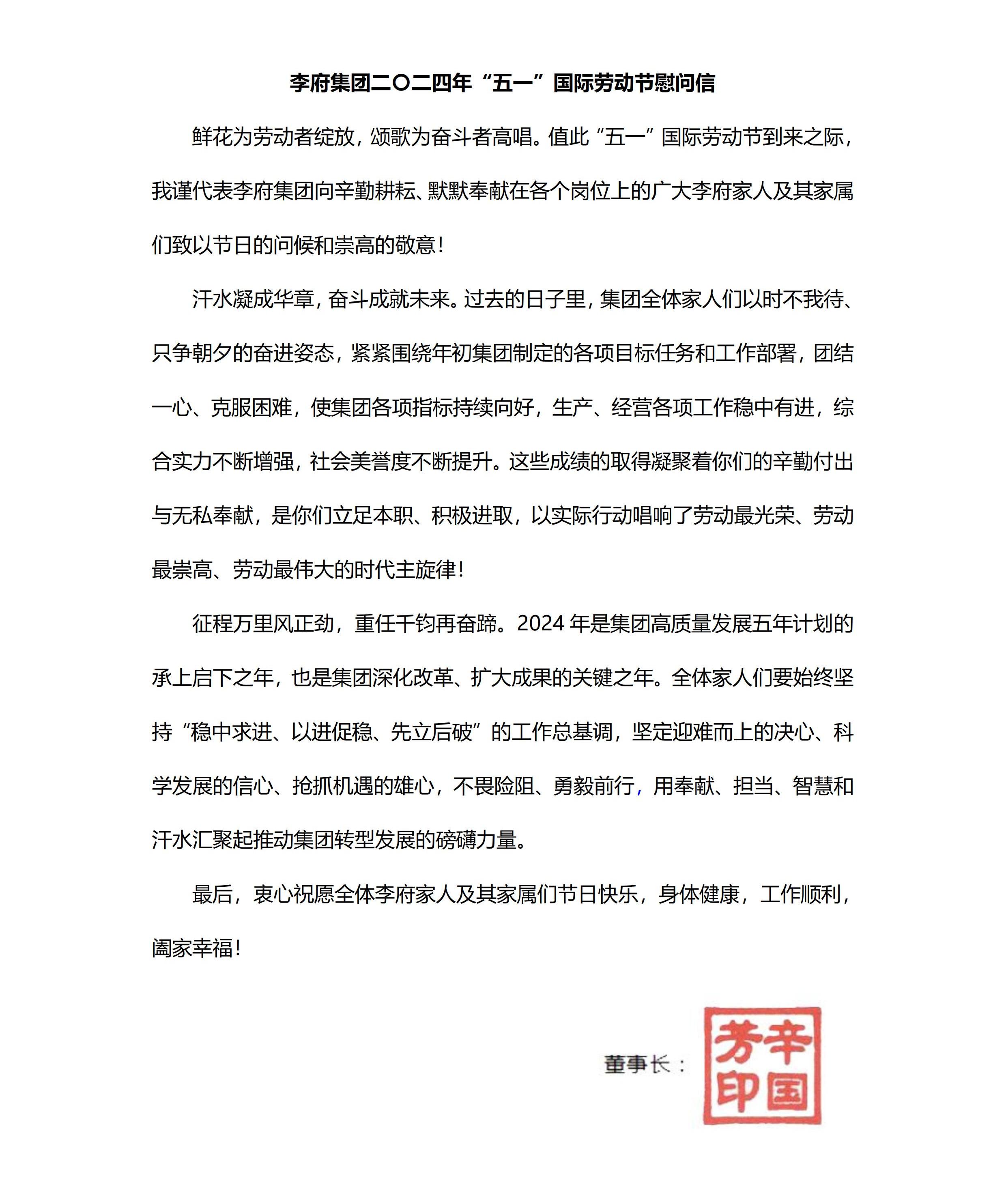 李府集团二〇二四年“五一”国际劳动节慰问信