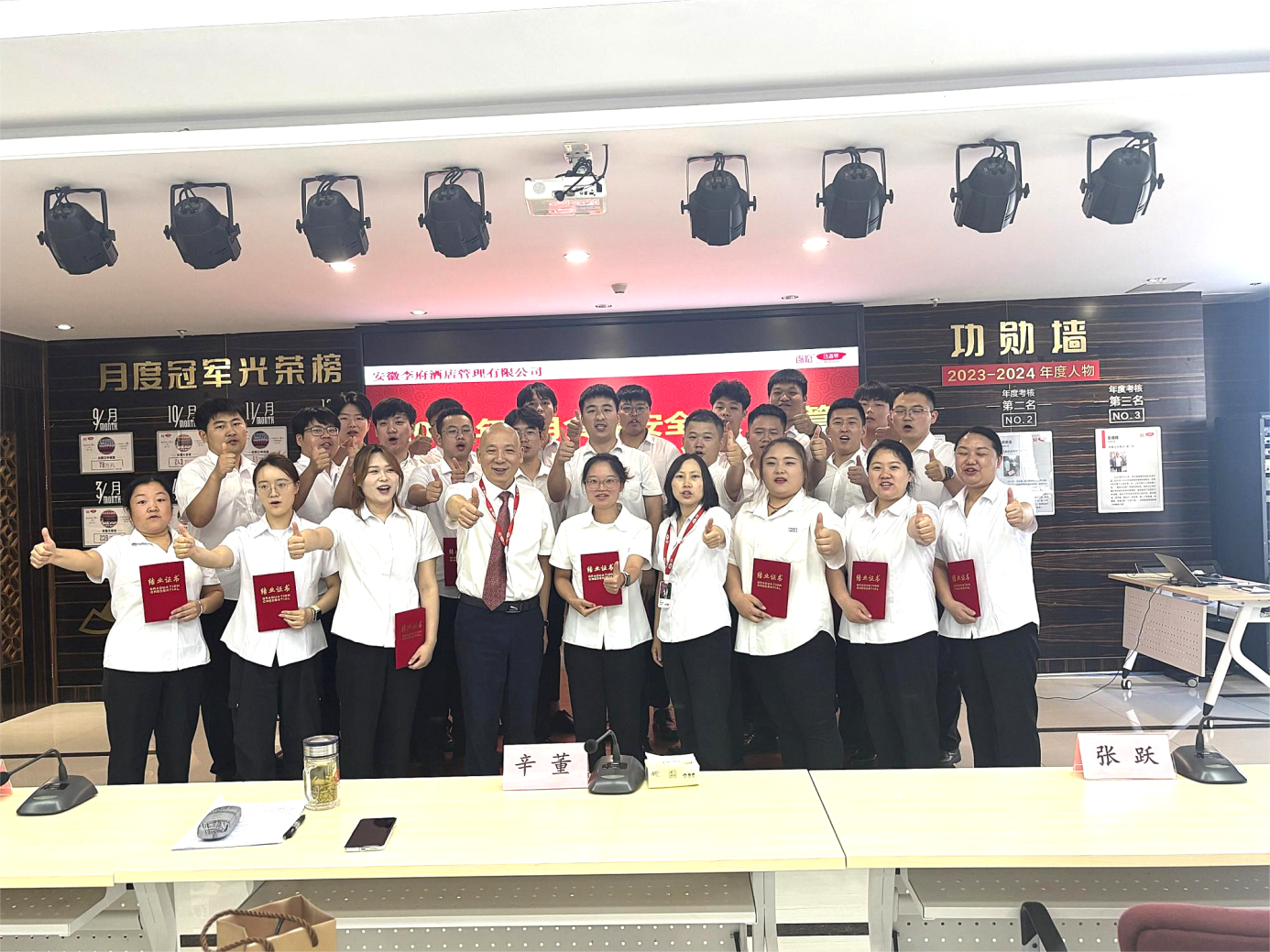 8月27日结业会议上,参训人员结合本次培训所学与日常工作实践,逐一分享学习感悟与总结。随后,会议主持人公布了结业考试成绩,所有参训人员均考核合格,顺利结业。集团董事长辛董亲临现场并分享,他指出,在工作中,要以学促干、知行合一,将所学知识运用到实际操作中,做到学用相长;要坚守原则、敢于担当,面对复杂情况和利益诱惑,坚守职业道德底线,勇担工作职责;要持续学习、主动成长,紧跟食堂管理工作发展变化,保持学习热情和主动性,提升自身能力。最后,辛董亲自为参训人员颁发结业证书并合影留念。