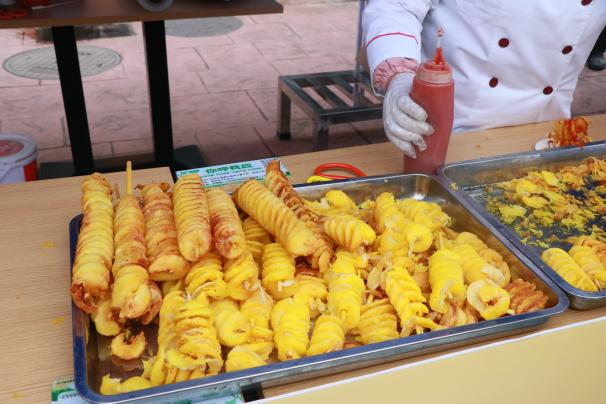 活动现场热闹非凡,浓郁的美食香气在空气中弥漫。同学们精心准备的文化表演精彩纷呈,充分展现了青春的活力与激情,为美食节增添了浓厚的文化氛围。主展台上,定制蛋糕、精致西点、新鲜水果与清爽饮品错落摆放;广场四周,美食摊位鳞次栉比,各类特色美食琳琅满目、香气扑鼻,令人垂涎欲滴。糖葫芦、蒙古烤肉、旋风薯塔、章鱼小丸子、户部巷烤面筋、铁板鱿鱼等小吃应有尽有,每一份美味都承载着对饮食文化的热爱与传承,吸引众多学生驻足品尝。