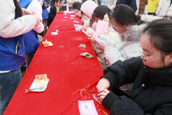 除了丰盛的美食盛宴,本次美食文化节还设置了丰富多彩的趣味互动环节。吉祥物猜拳互动、幸运敲门、谁是卧底、你画我猜等活动吸引大批学生踊跃参与,现场欢声笑语此起彼伏,汇成一片欢乐的海洋。同时,非遗手工香囊制作、糖画创作等传统体验活动也备受青睐,不仅为师生搭建了接触、了解传统文化的优质平台,更丰富了活动的文化内涵,让大家在实践中感悟中华文化的博大精深,在体验中传承优秀文化经典。